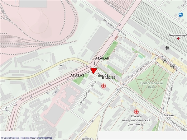 Сталеваров ул., пересечение с ул.Маяковского и Комсомольской (стороны А1-А3 - при движении из центра, к Кирилловскому шоссе и гипермаркету "Лента", 150м до поворота к ж/д- и автовокзалу, А4-6 - при движении в центр, к ж/д- и автовокзалу, Б1-Б3 при движении от Советского пр-та)