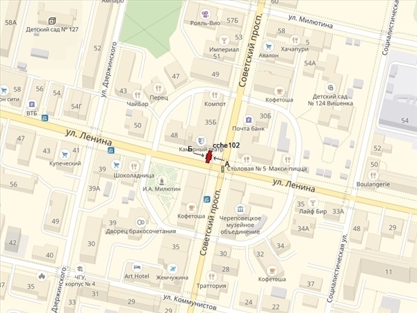 Ленина ул., на пересечении с Советским пр-том, 35Б, у Камерного театра, справа при движении к ул. М.Горького